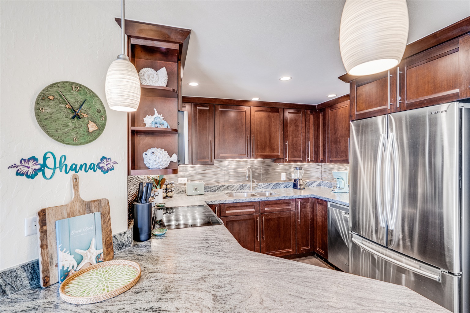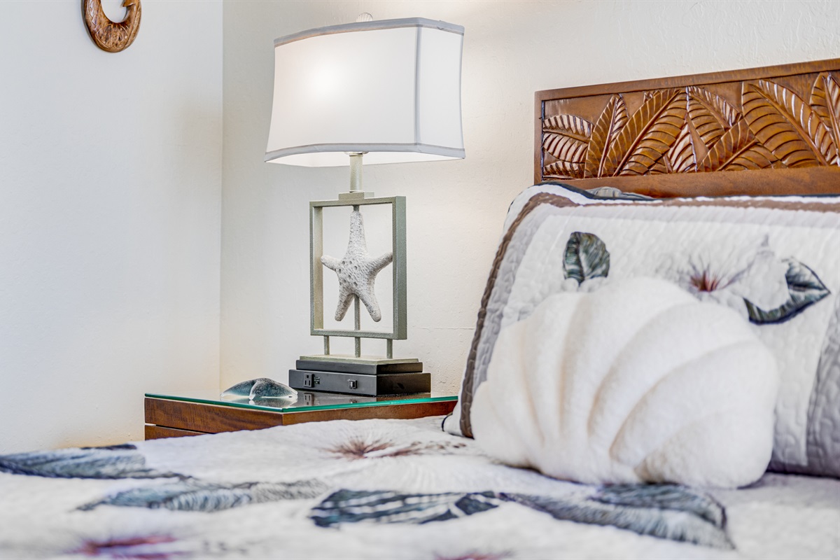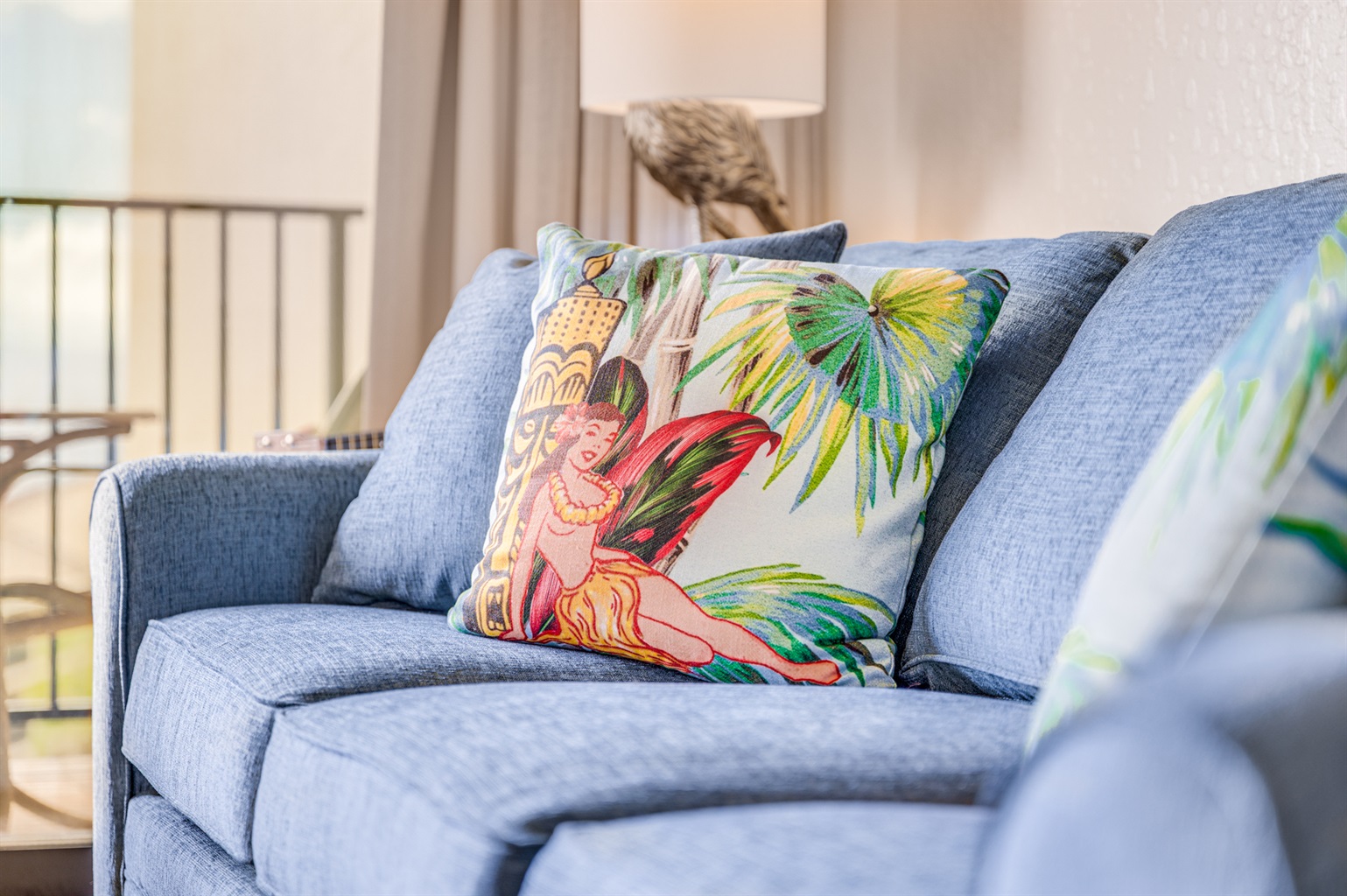 Inside, enjoy fresh tropical decor and cozy beds, including a sofa bed to allow for a 6-person family or group of friends to share the condo. There’s a full kitchen to cook up some local fish and veggies for your group, or make a cup of coffee to sip on the lanai before you head out for the day!