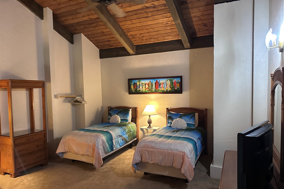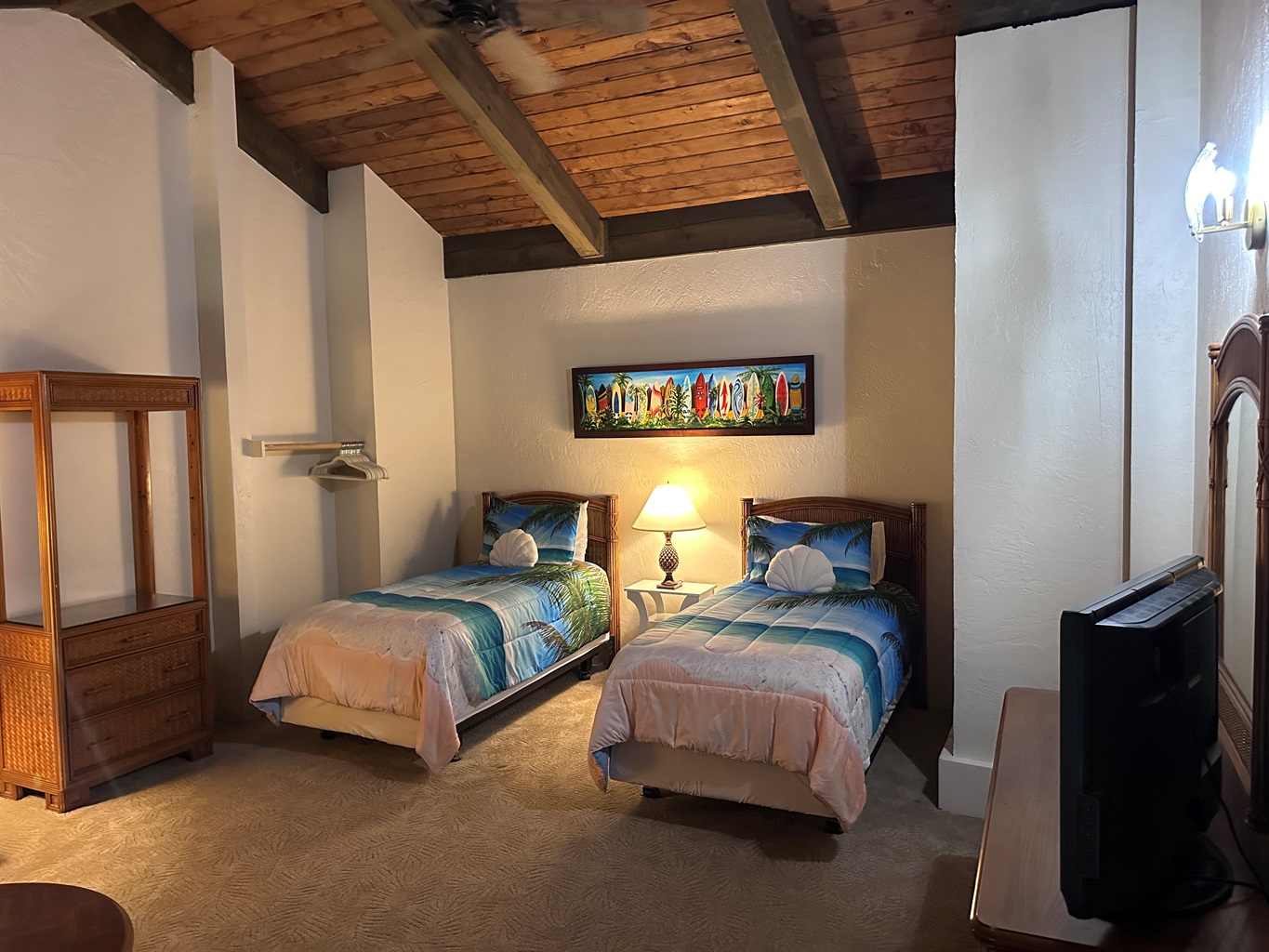 The primary suite features a cozy king bed, offering a peaceful place to unwind after a day of island adventures. The second bedroom includes a comfortable queen bed, while the airy loft upstairs provides two twin beds—perfect for kids or additional guests.